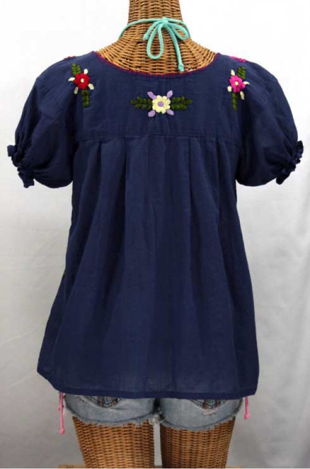 • Ornate hand embroidery and traditional puff sleeves, available here in navy blue with multi-color embroidery.