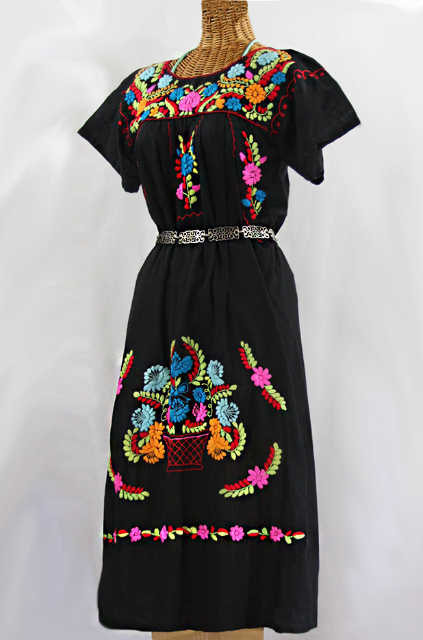 "La Primavera" Embroidered Mexican Dress - Charcoal + Maroon