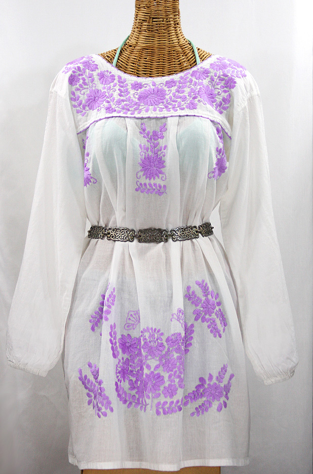 "La Mariposa Larga" Embroidered Mexican Dress - White + Purple