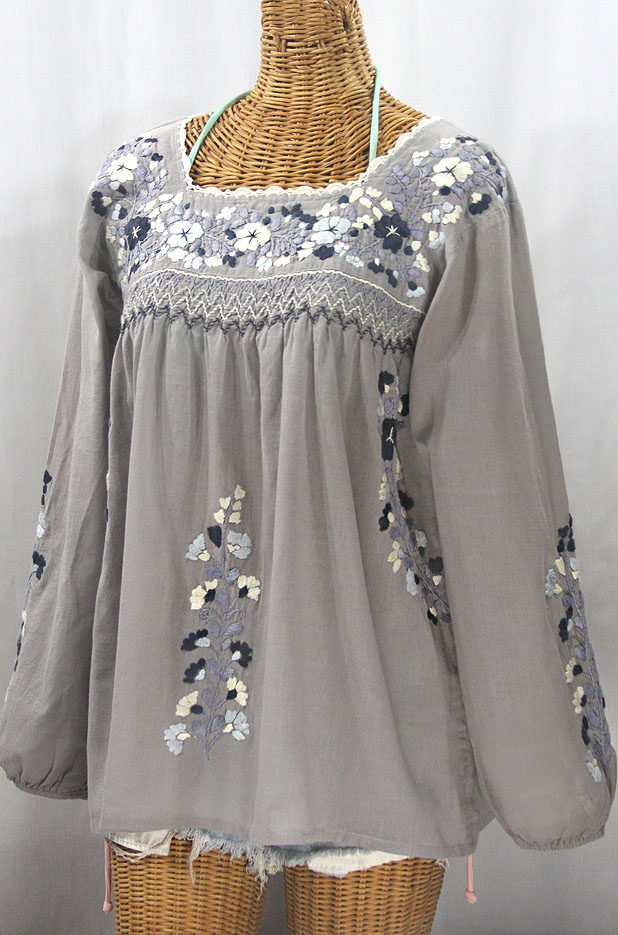 "La Marina Larga" Embroidered Long Sleeve Peasant Blouse - Grey + Grey Mix