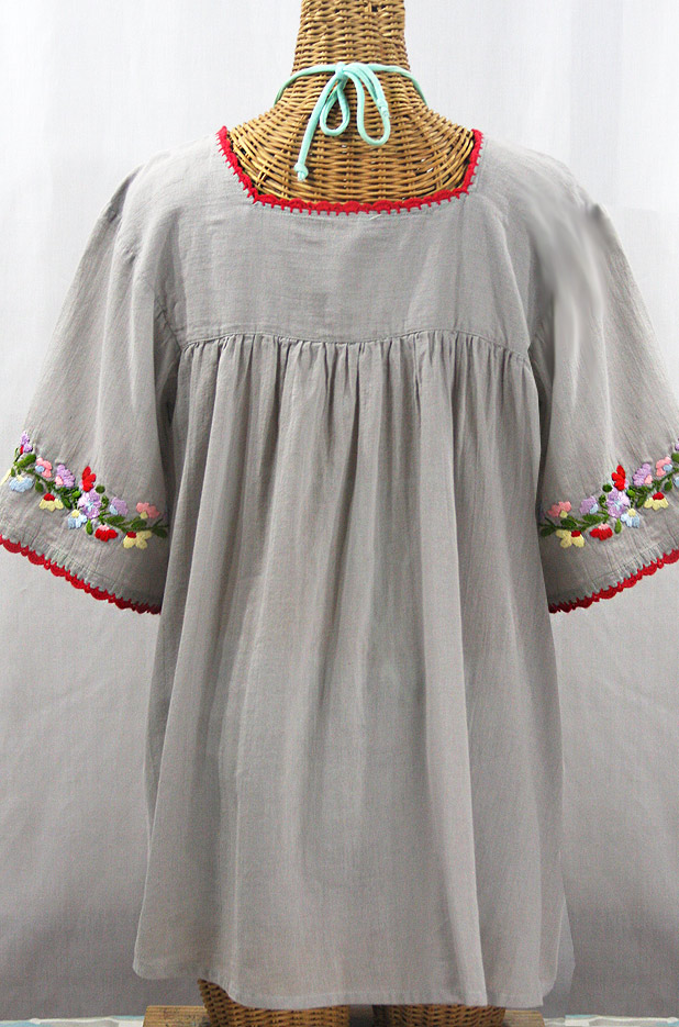 • Ornate hand embroidery and smocking with hand crocheted trim on the neck and 3/4 sleeve hems, available here in grey with multi-color fiesta-style embroidery.