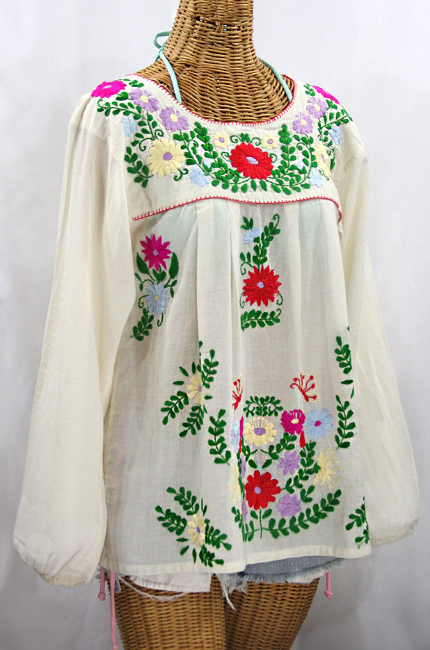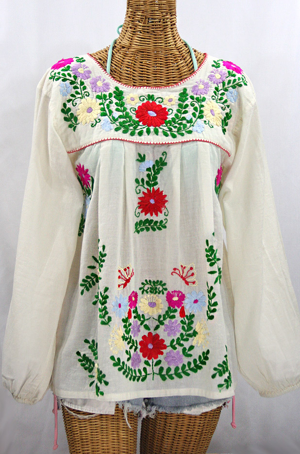 "La Mariposa Larga de Color" Longsleeve Mexican Blouse - Off White + Bright Multi