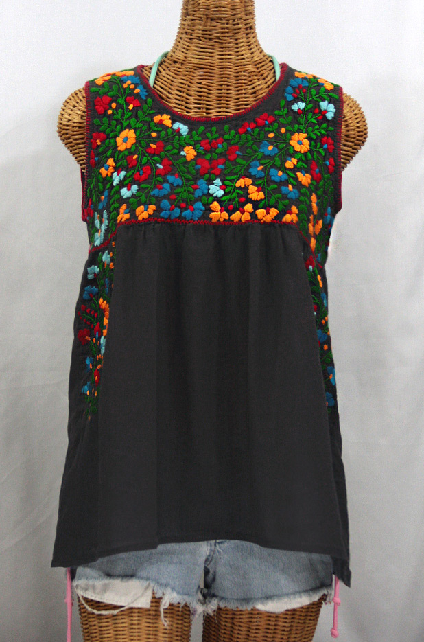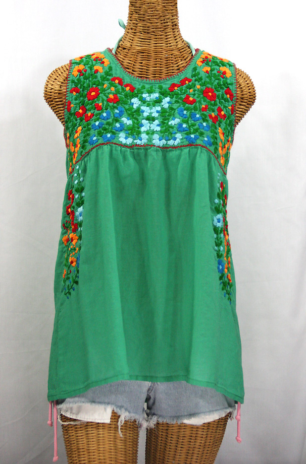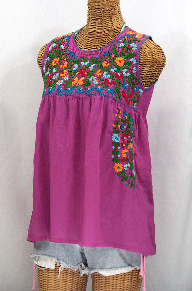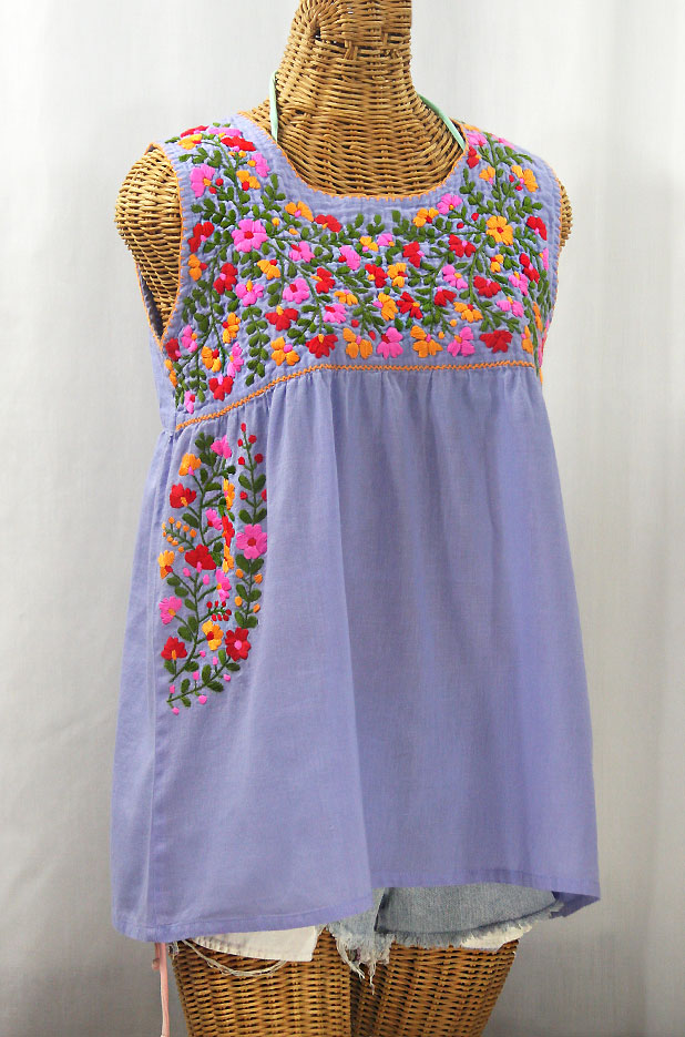 Artfully hand embroidered, our Vintage Mexican-styled sleeveless "La Sirena" and "La Pasea" peasant tops capture the essence of the beach gypsy's lifestyle: Adventurous, care-free and ever beautiful. The Pasea and Sirena feature the same unique sleeveless tank-top syle cut, but the Sirena's embroidery is dense and detailed while the Pasea's is big and bold. Both are hand made of light and airy 100% cotton fabric caringly embroidered by hand. Both colorful and ornate floral patterns are a faithful tribute to the time honored traditional Oaxacan Huichol style peasant blouses popularized in the 1970's. The "La Sirena" and the "La Pasea" tank tops are super light and cool, making them the perfect cover-up for any beach adventure.