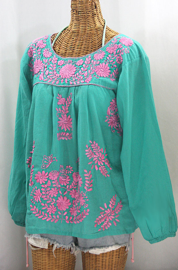 • Ornate hand embroidery and elegant long sleeves with puff cuffs, available here in mint with pink embroidery.