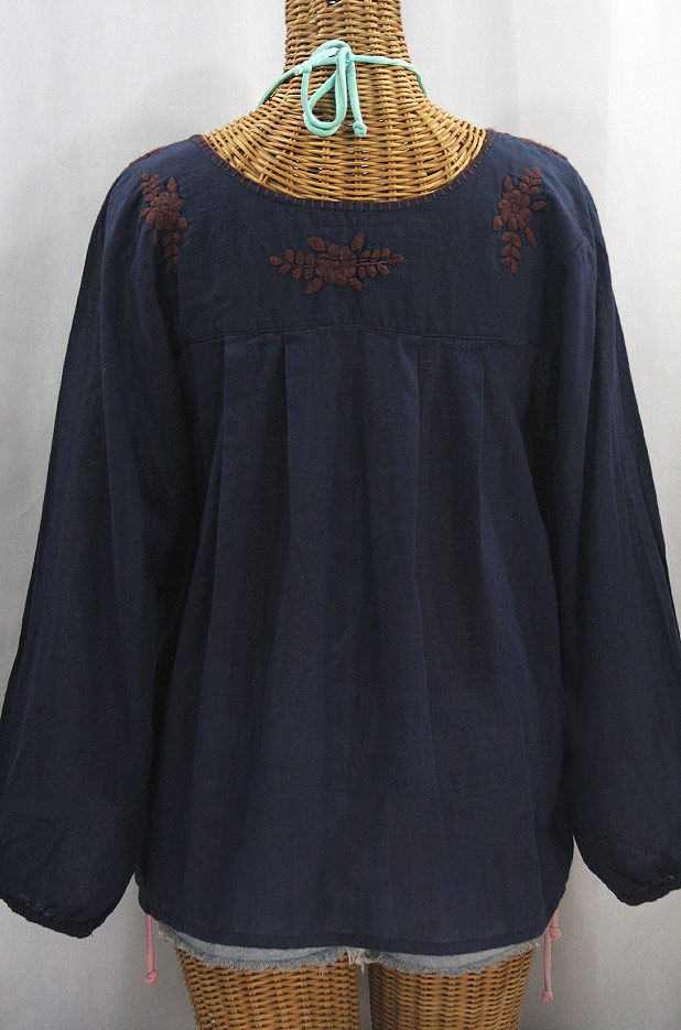 • Ornate hand embroidery and elegant long sleeves with puff cuffs, available here in navy with brown embroidery.
